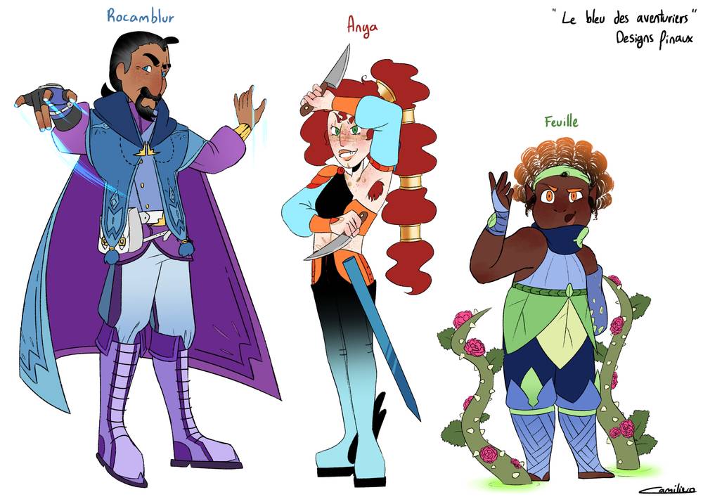 Rocamblur : bleu, aventurier, violet, mage, gris citadin. Il est le leadeur, plus âgé et plus sage. Beaucoup de prestance. Des ornements attestant son importance. Un air assuré. Le plus responsable avec une sacoche. Les vêtements flottants puis ramenés à son corps parlent de sa liberté et de sa responsabilité vis-à-vis du groupe.