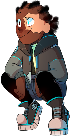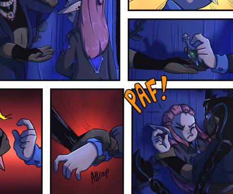 Anya : bleu, aventurière, noir, guerrière, orange, artiste. Dégradé montrant son caractère changeant. Tatouages importants dans l’histoire, directement reliés au fait qu’elle est une survivante de secte. Les bottes avec les ailes, car elle a pris son envol. Les quatre parties de sa coiffure pour les quatre parties de sa vie. Agile, hyperactive à travers sa silhouette élancée et ses mouvements précis.
