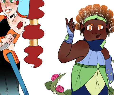 Feuille : bleu, aventurière, verte, ethnel (elfe). Principalement des vêtements près du corps pour le côté proche de la nature. Cou et bras gauche couvert pour protéger ses arrières. Pieds nus pour lien avec la nature, toujours. Beaucoup de référence à son nom sur elle. Vêtements peu compliqués, car elle est quelqu’un de simple.